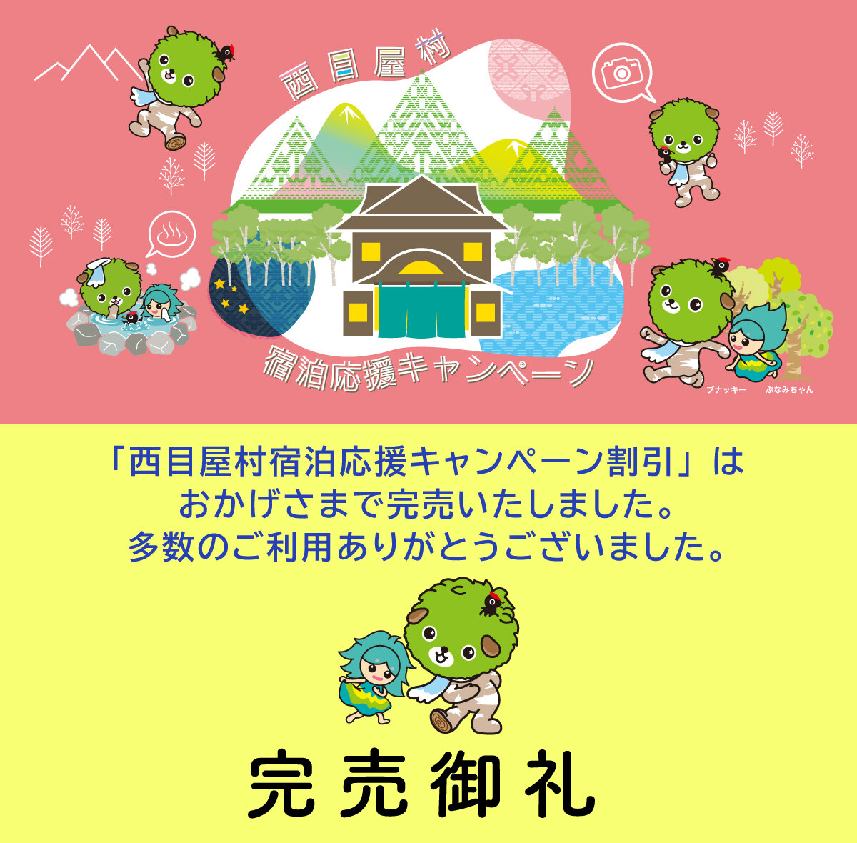 キャンペーン 2022年6月27日 「西目屋村宿泊応援キャンペーン」完売のおしらせ 「西目屋村宿泊応援キャンペーン」は ブナの里 白神館、もりのいずみ 共に割当額の上限に達した為、完売いたしました。 なお、お手持ちのクーポンは宿泊日の翌月末までご利用可能です。 利用可能店舗等はこちら みなさまの多数のご利用、誠にありがとうございました。